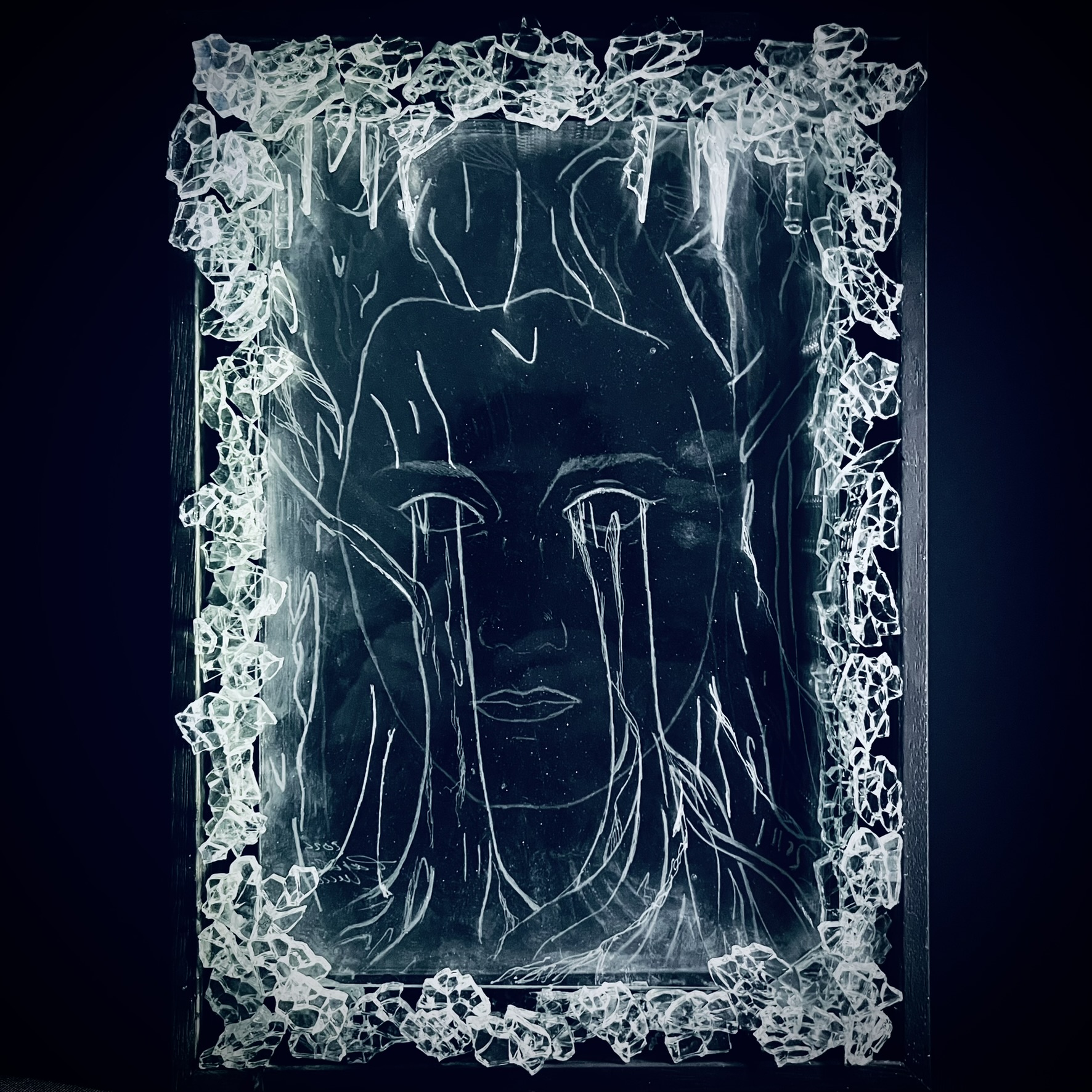 Verre gravé, et cadre en bois – 26×36,5 x 3,7 cm (avec le cadre) -2024
